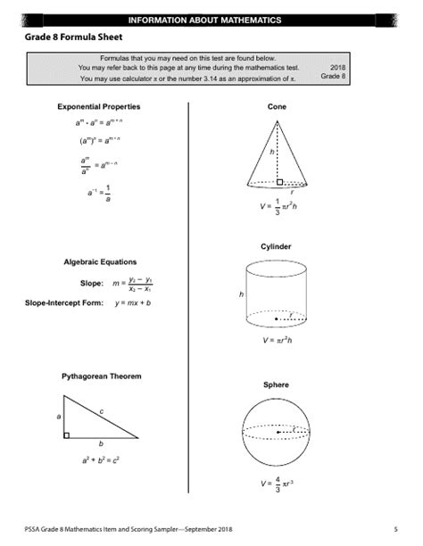 pssa grade 8 math formula sheet
