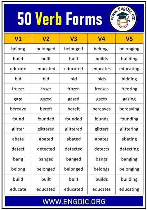 write 50 verbs and their different forms